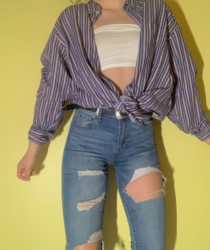 For this look I simply took a men’s striped button-down shirt and tied the two sides together in the front. I added a white top underneath and some basic ripped jeans. The nice part about this outfit is that it can look vintage even with a modern shirt- just make sure it is over sized and has a fun pattern.