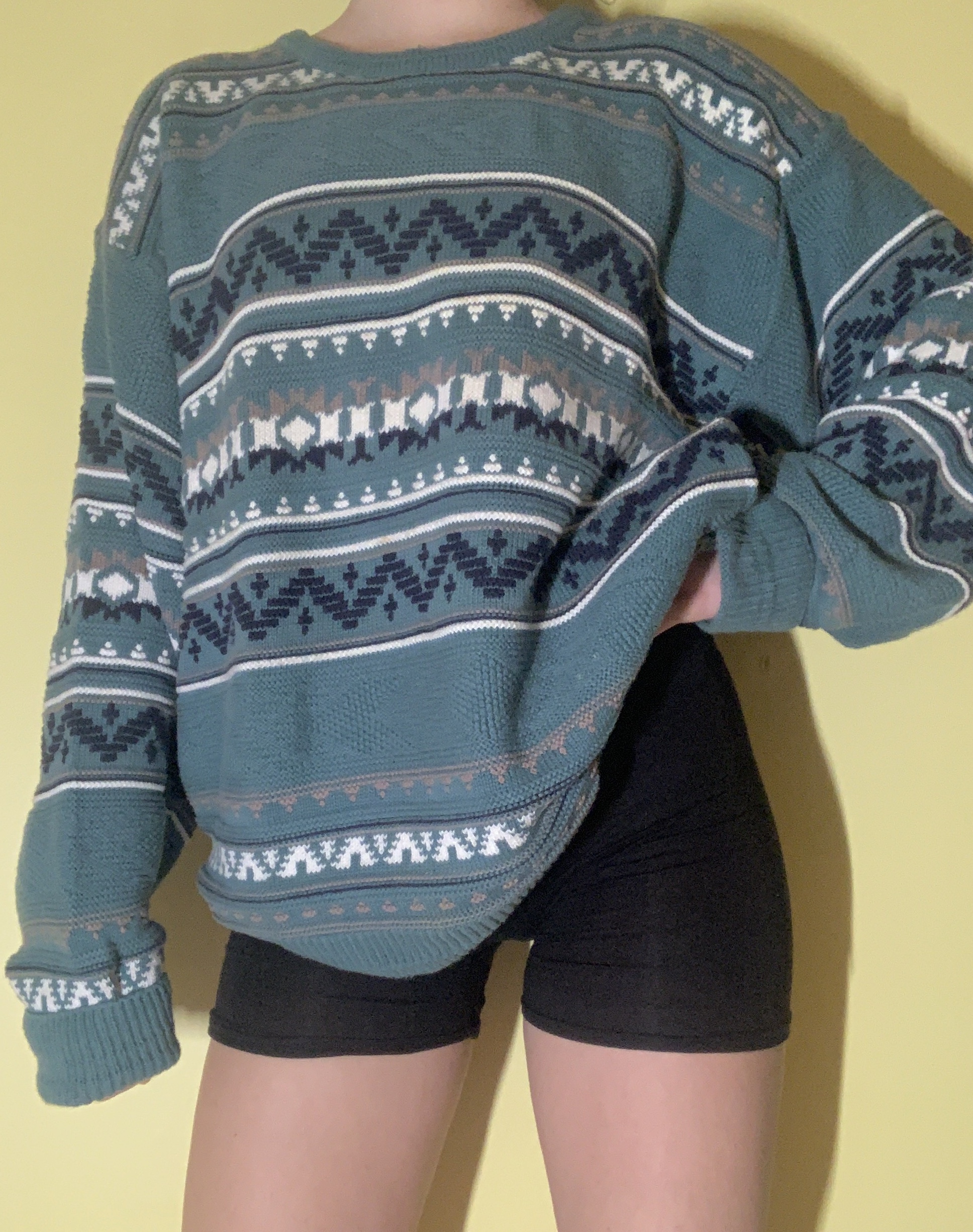 4. This last outfit idea just involves a vintage sweater and some biker shorts. Again, it works best with a colorful, patterned sweater instead of a plain one.